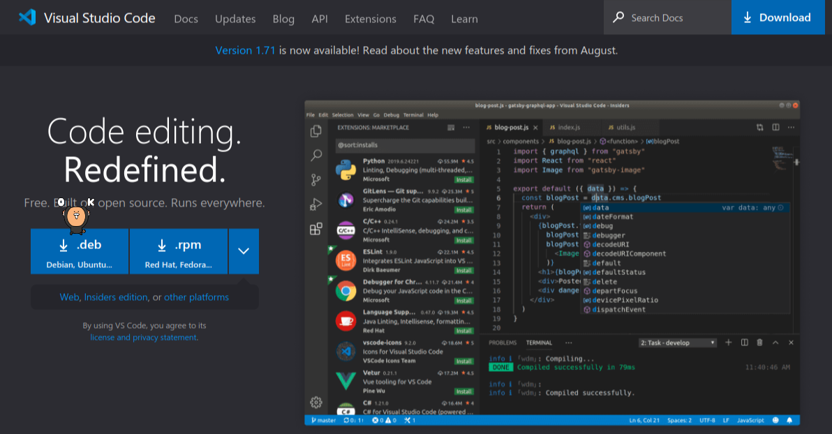 Visual Studio Code is a code editor redefined and optimized for building and debugging modern web and cloud applications. Visual Studio Code is free and available on your favorite platform - Linux, macOS, and Windows.