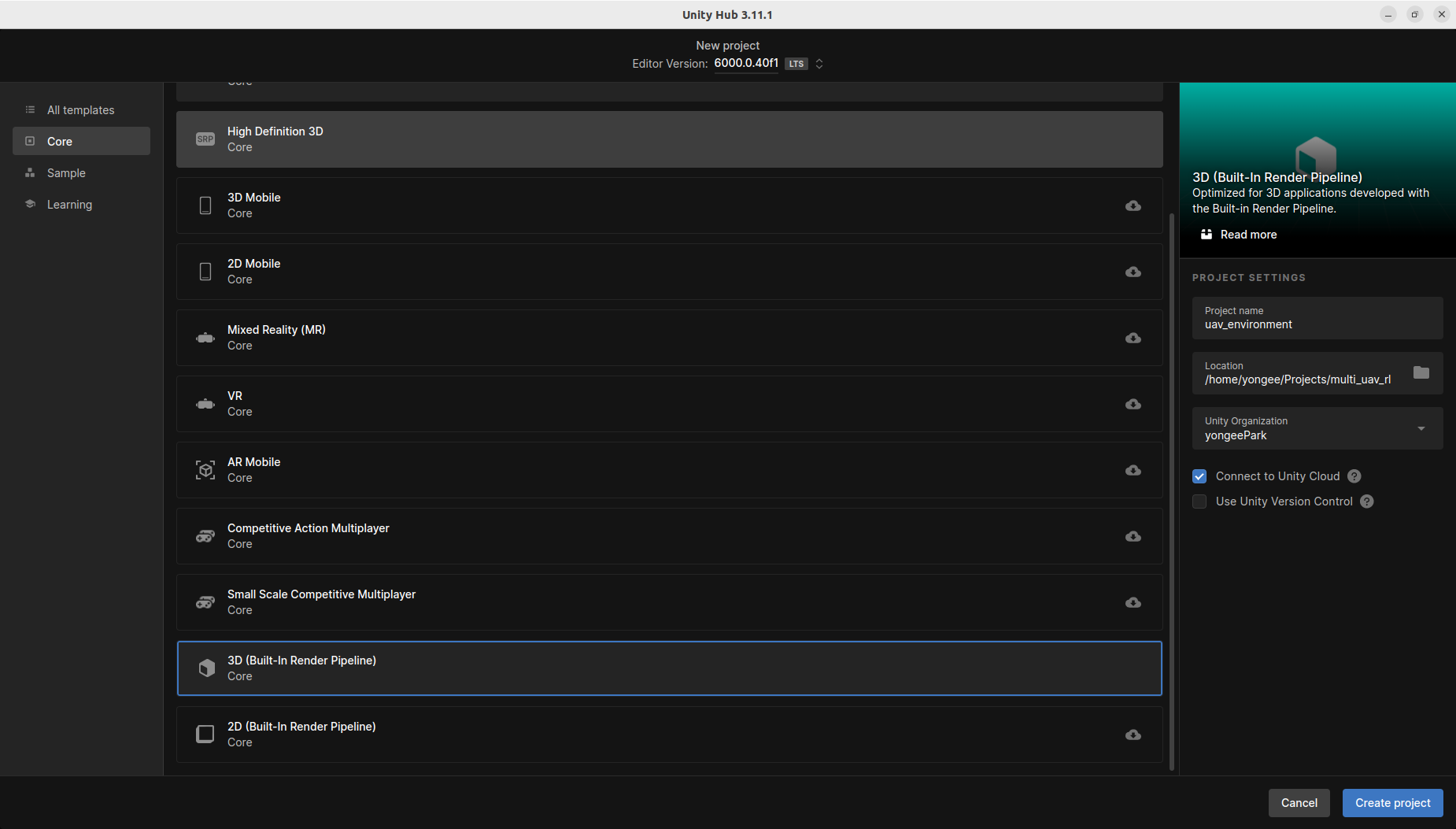 - 템플릿은 3D (Built-In Render Pipeline) 선택