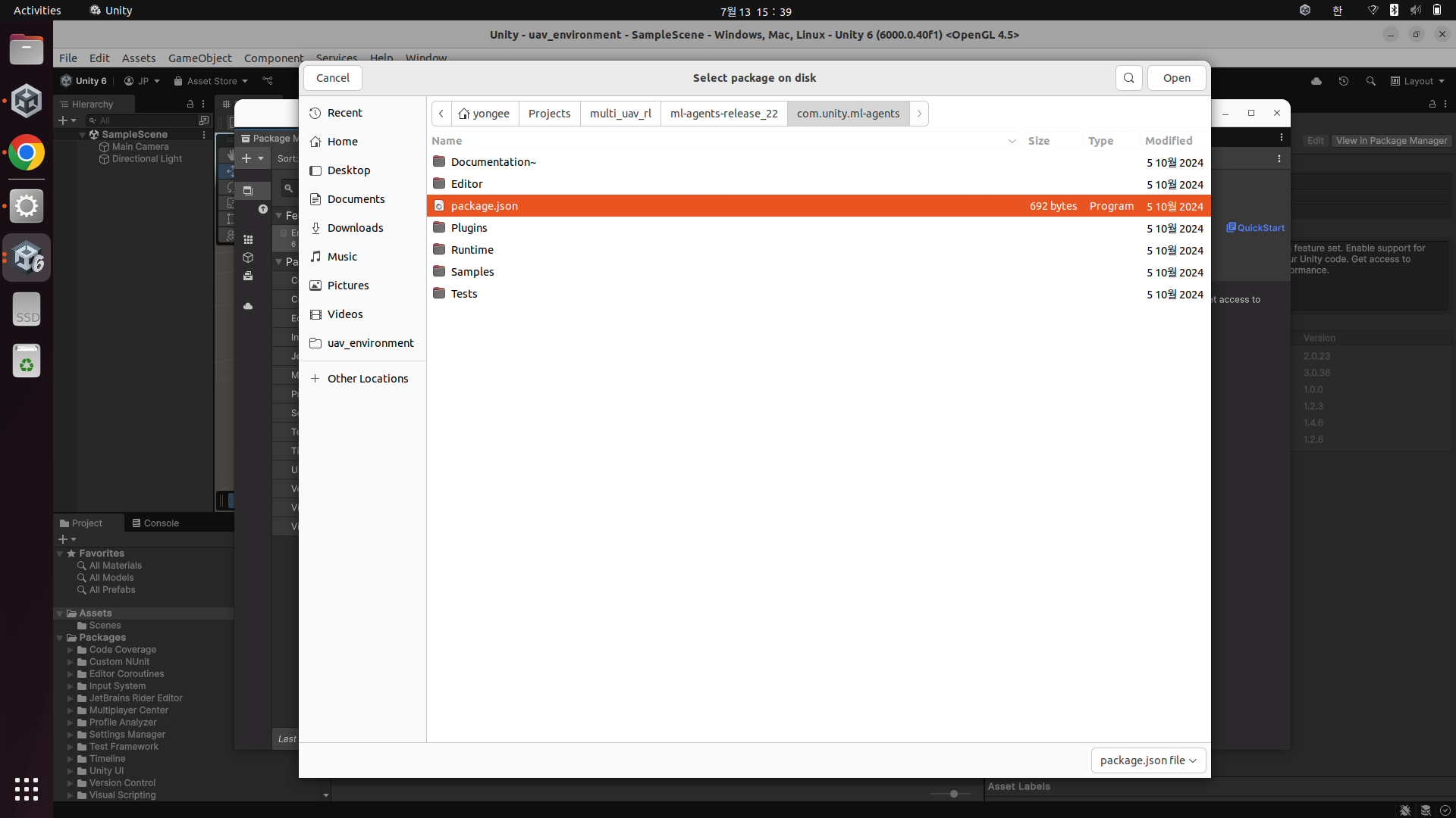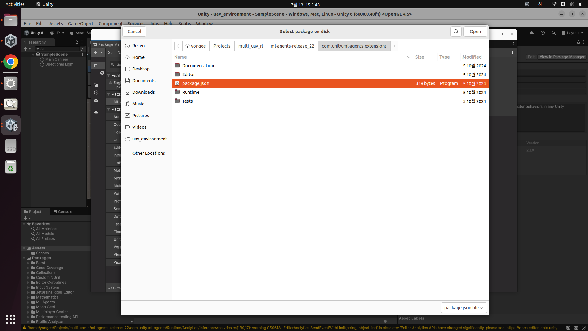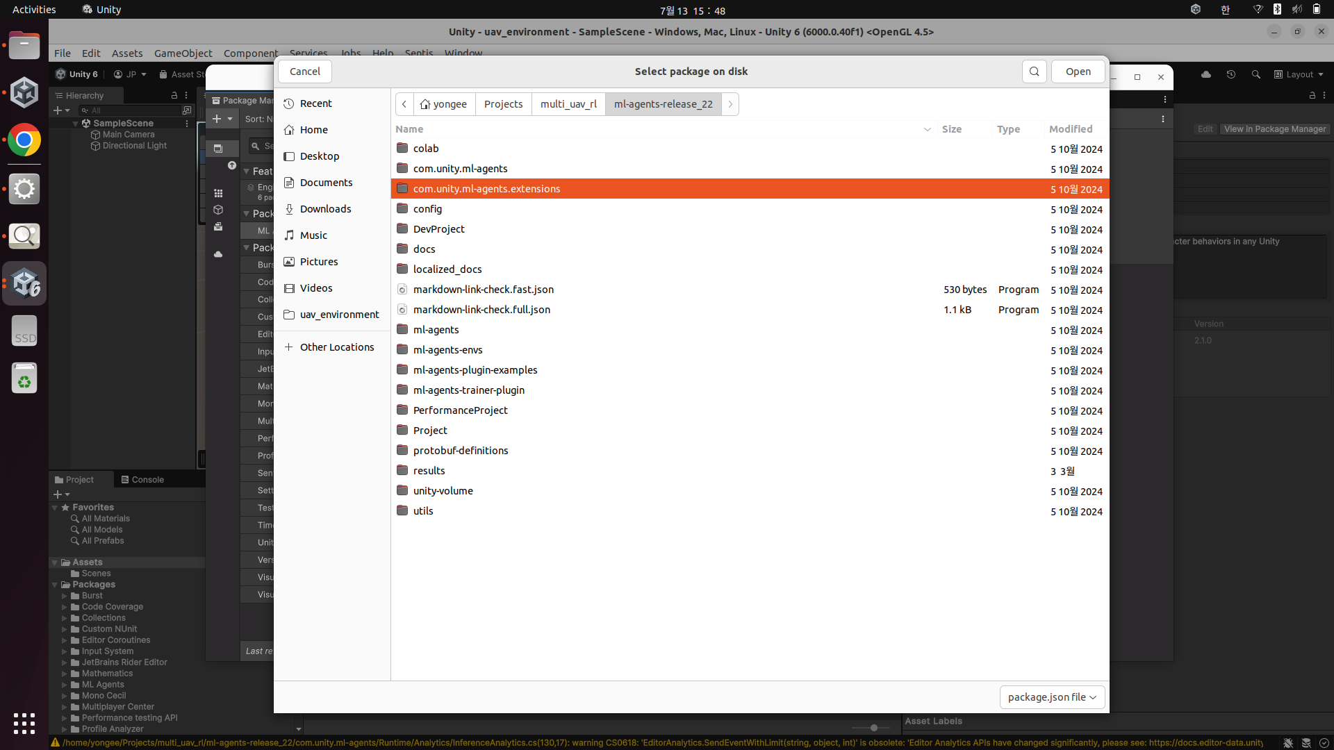 - package.json 선택 후 기다리면 ML-Agents Extensions 설치 완료