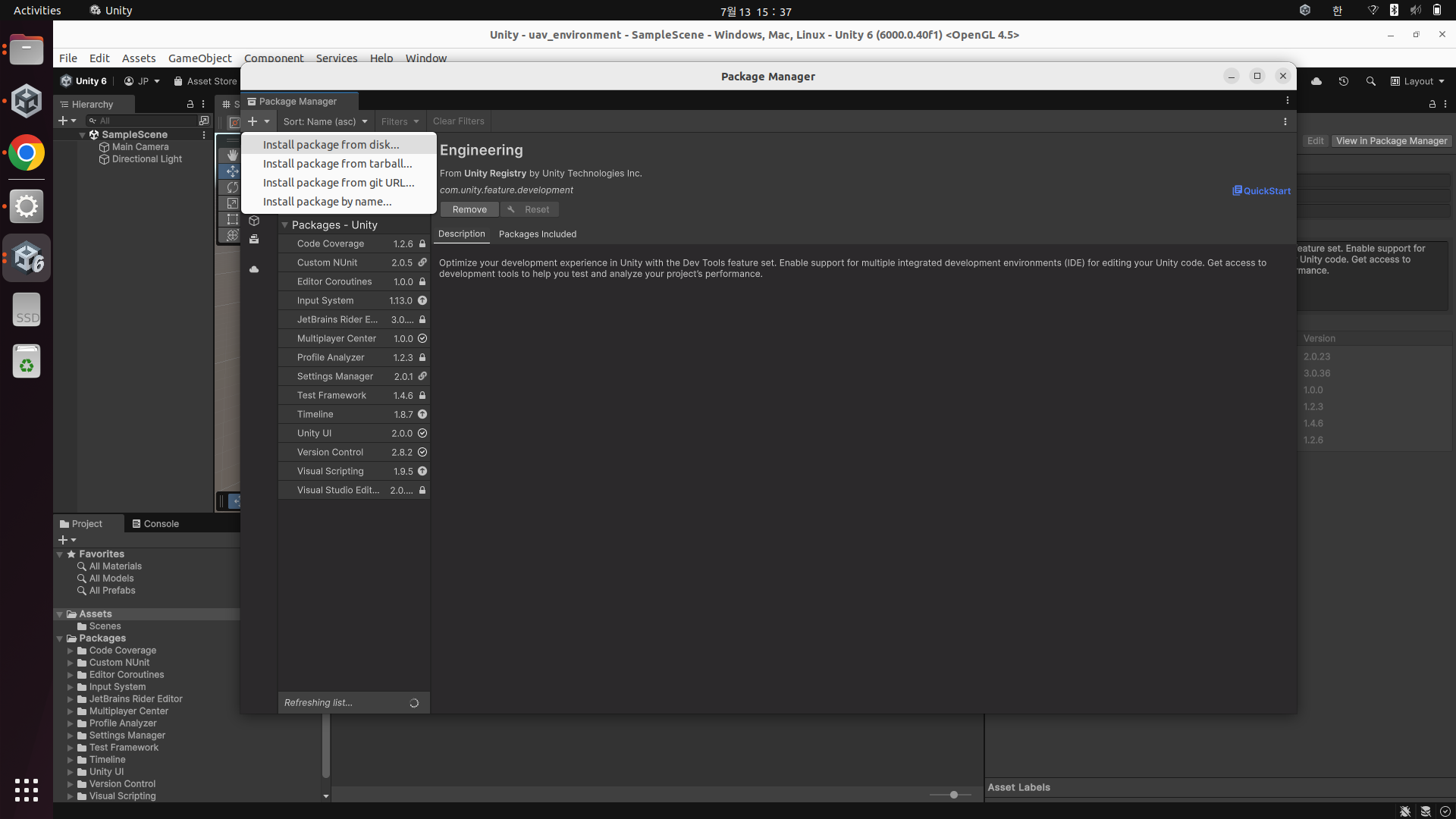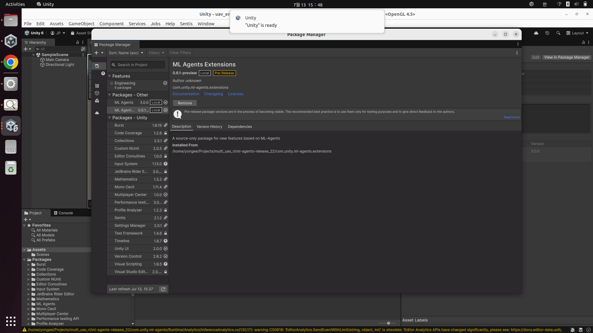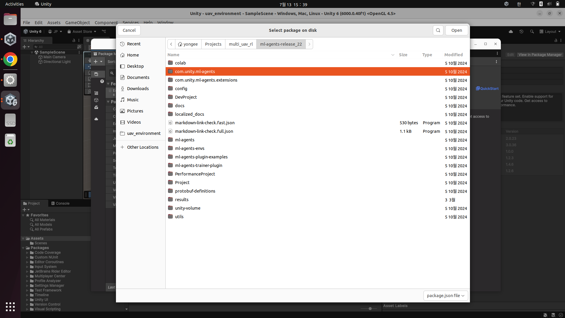 - package.json 선택 후 기다리면 ML-Agents Extensions 설치 완료