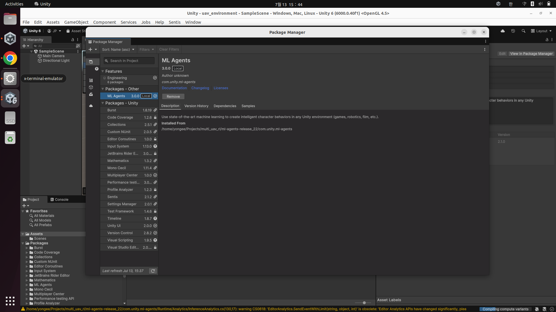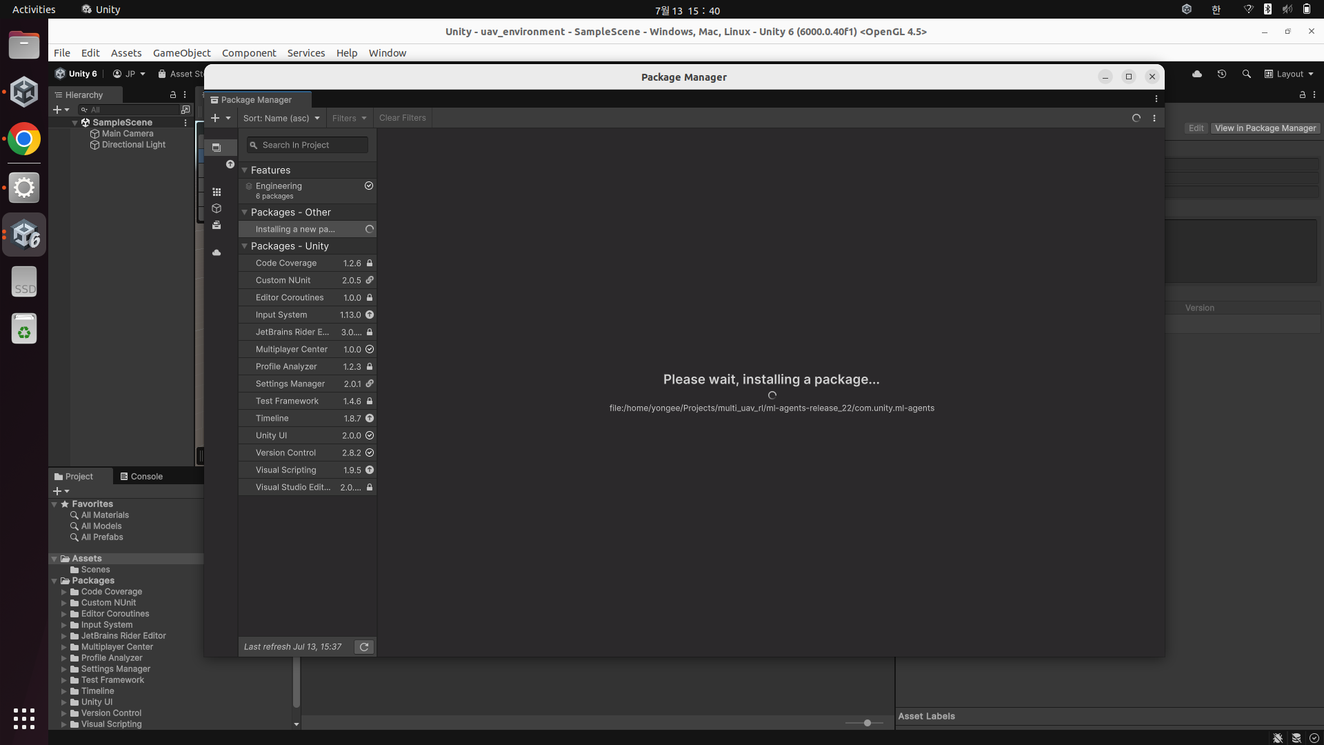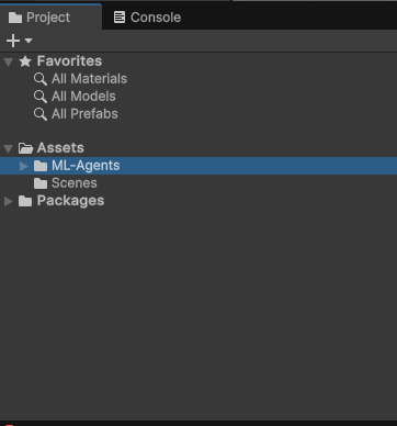 - ML-Agents 폴더를 현재 유니티 프로젝트 화면 좌측 하단 Project 뷰 내 Assets 폴더로 드래그 앤 드롭