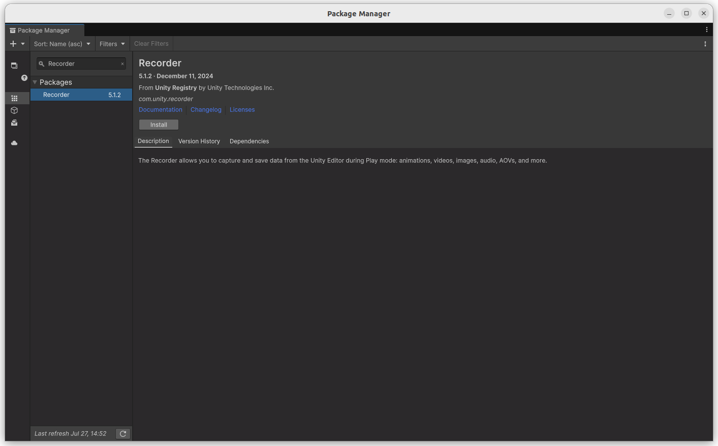 - Recorder 패키지가 나오면 Install 클릭하여 설치
