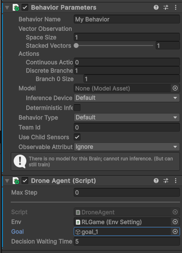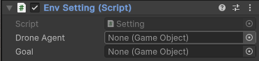 - Drone Agent 스크립트에서 3.1과 동일하게 Env에는 RLGame, Goal에는 goal_1 오브젝트 연결