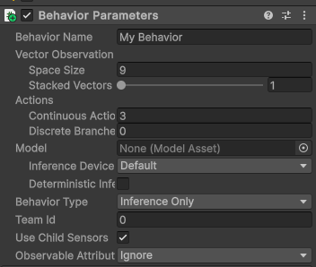 - Actions : Continuous Action : 3, Discrete Branches : 0으로 수정 (x,y,z축 속도)