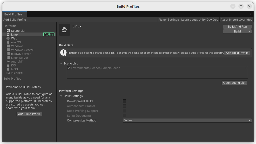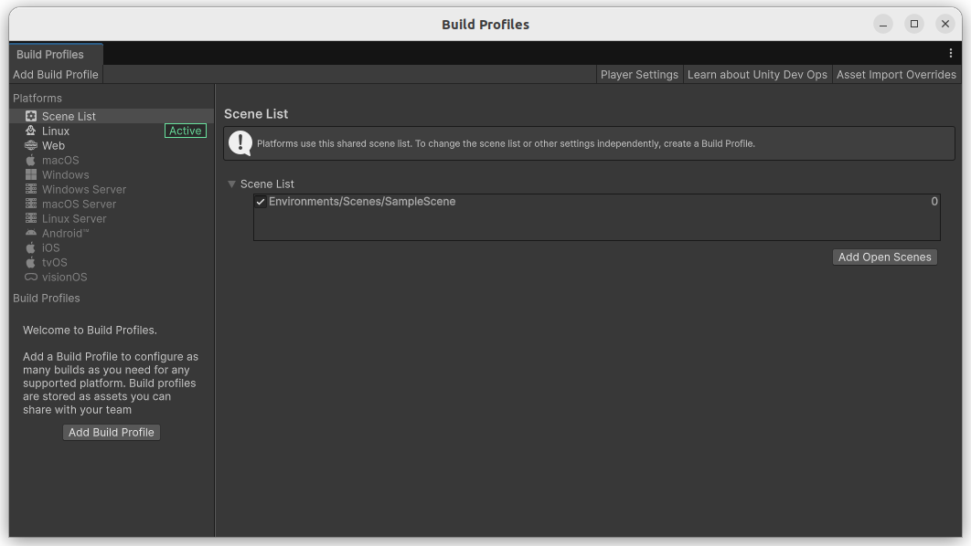 - Build Profiles에서 Open Scene List 클릭