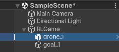 - 좌측 하이러키 창에서 RLGame 오브젝트(드론과 장애물이 포함된 오브젝트) 선택