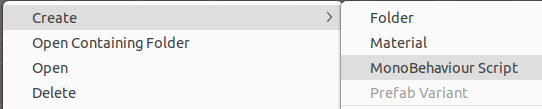 - Scripts 폴더 안에서 마우스 우클릭 - Create - MonoBehaviour Script 클릭하여 파일 생성
