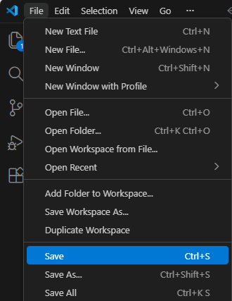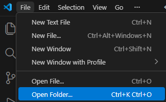 이후 VSCode 좌측 상단 메뉴 바에서 File - Open Folder... 를 선택합니다.