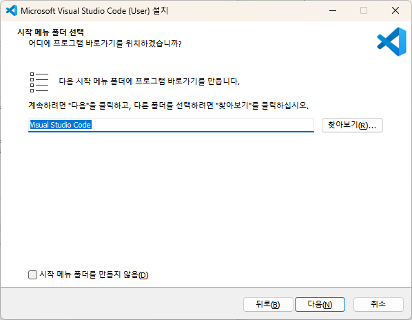 시작 메뉴 폴더 선택도 마찬가지로 기본 설정을 유지하되, 변경하고자 하는 경우 찾아보기 를 눌러서 변경합니다.