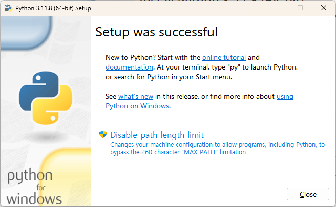Disable path leng limit 을 클릭한 다음 close를 눌러 창을 닫아줍니다.
