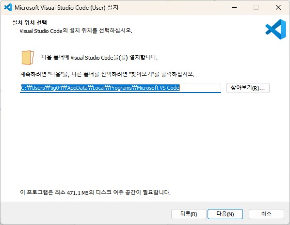 만약 설치 위치를 변경하고 싶을 경우 찾아보기 버튼을 눌러서 직접 지정합니다.
