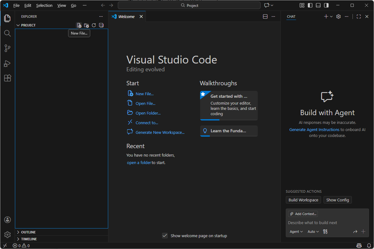 PROJECT 클릭 후, 마우스를 우측 첫 번째 아이콘에 올리면 New File... 이라는 설명이 나타납니다.