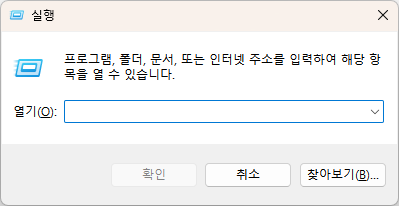 윈도우에서 시작 버튼을 누른 다음 '실행'을 검색하여 실행합니다.