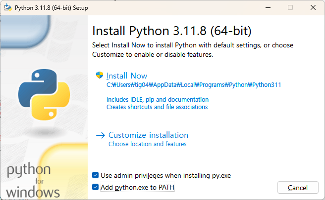 파이썬 설치 경로를 바꾸고 싶거나 추가적인 설정을 원할 경우 Customize installation을 선택하시고, 환경변수를 따로 관리하고 싶으신 분들은 Add python.exe to PATH를 체크하지 않으셔도 됩니다.