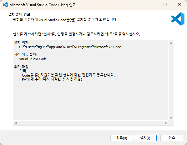 그러면 다음과 같이 설치 준비가 완료되었다는 창이 나옵니다. 설치 버튼을 눌러 설치를 시작합니다.