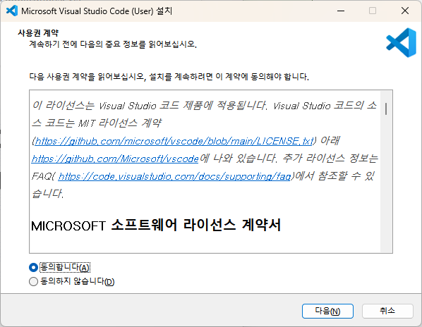 사용권 계약은 동의합니다 를 선택한 후 다음을 선택해 넘어갑니다.