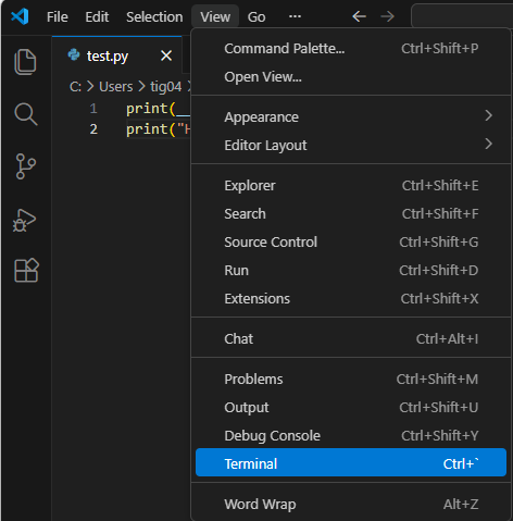 상단 메뉴에서 View - Terminal을 선택합니다.