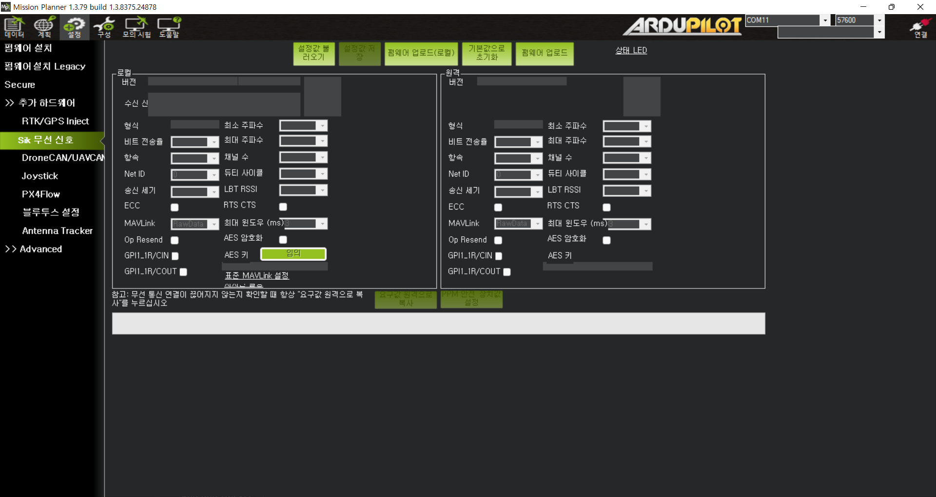 5. Com port 선택, 대역폭 57600 설정 후 '설정값 불러오기' 선택