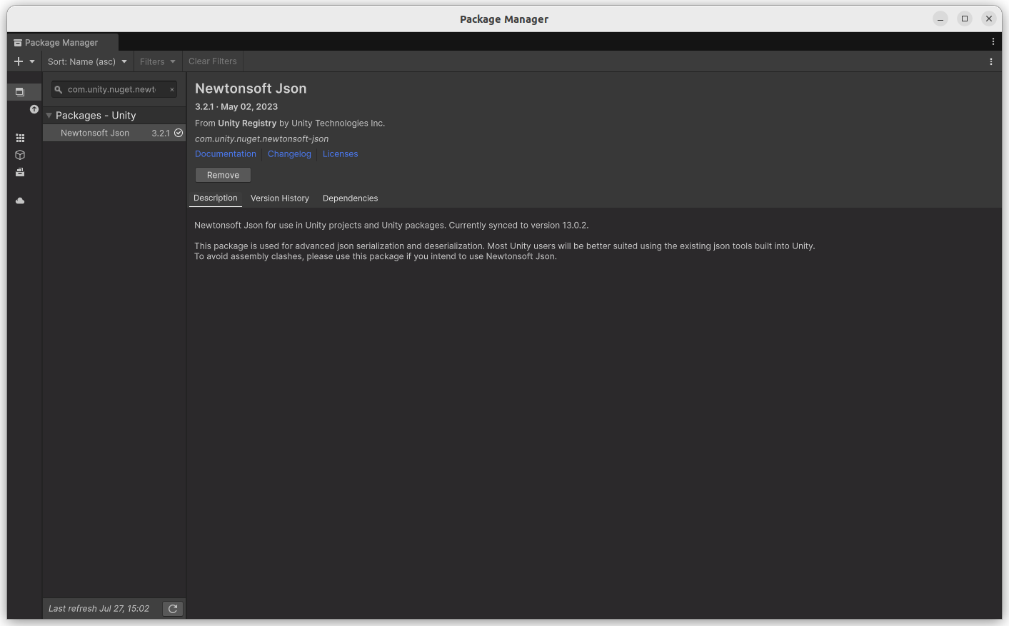 - Newtonsoft Json 패키지가 검색되어 자동으로 설치됨