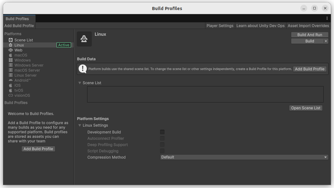 - 상단 메뉴바에서 File - Build Profiles 클릭